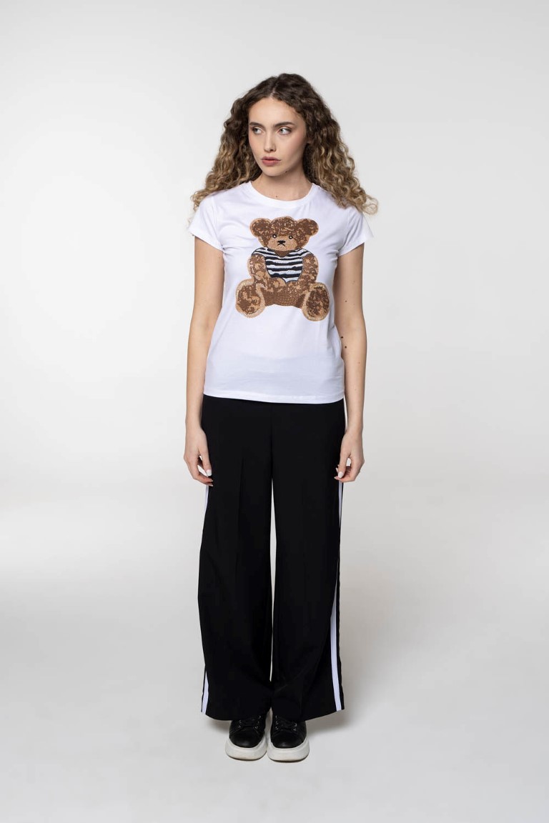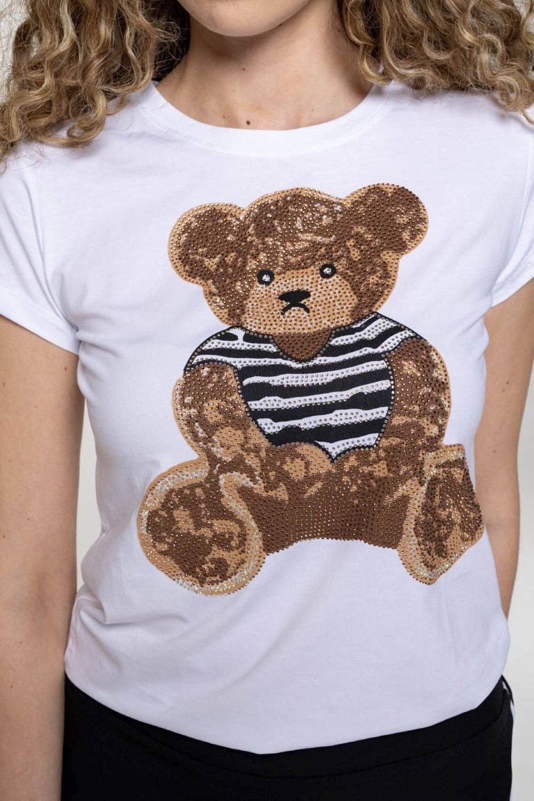 Bijela pamučna majica sa šljokastim medekom.
