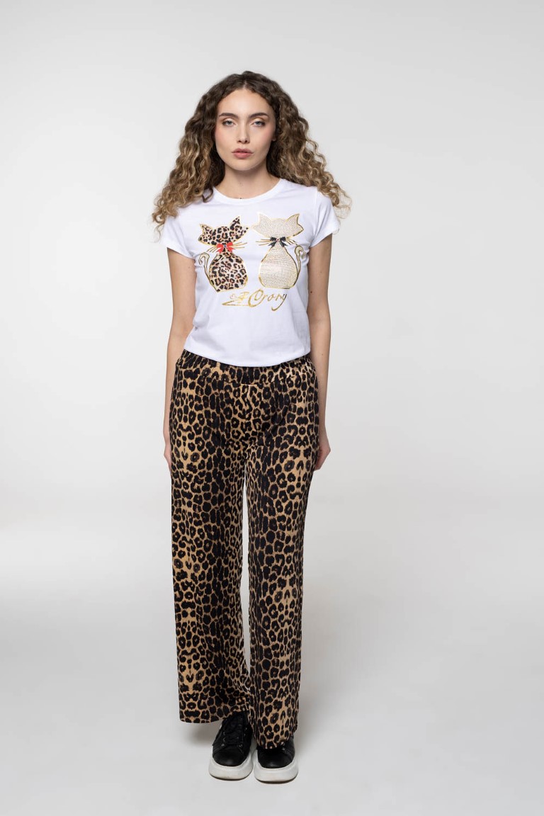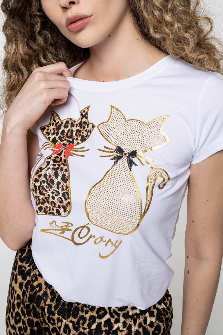 Bijela pamučna majica sa šljokastim mačkama.
