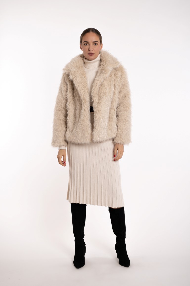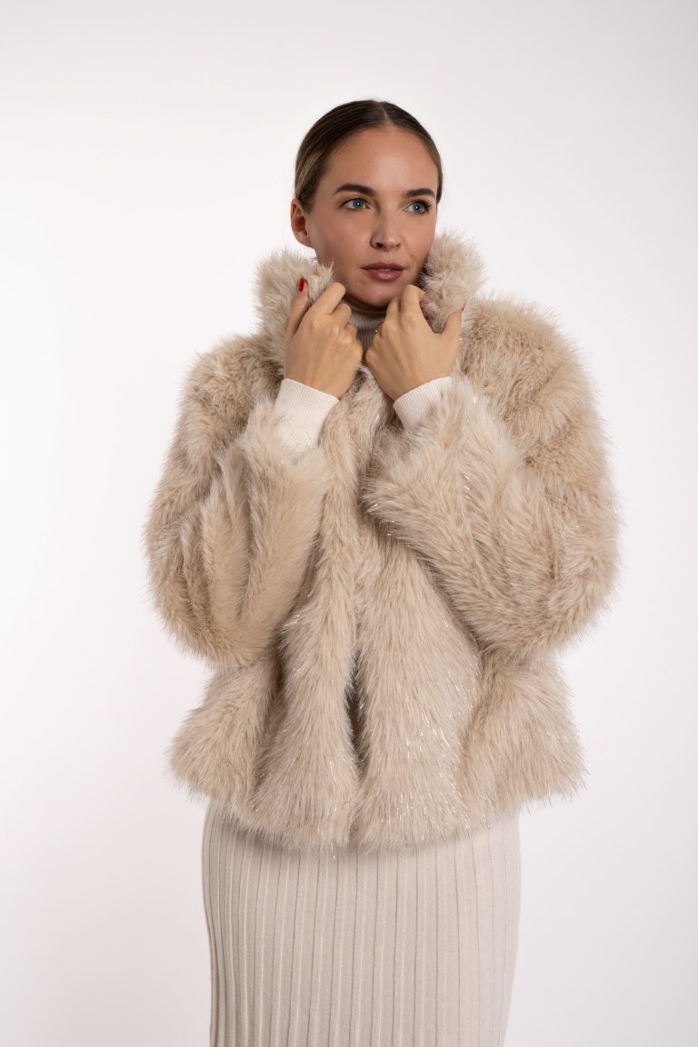 Kratka bundica od umjetnog krzna sa sjajnim nitima- bež