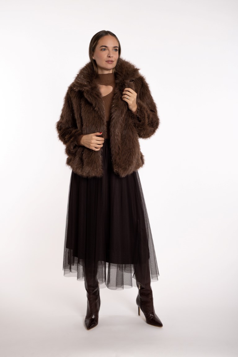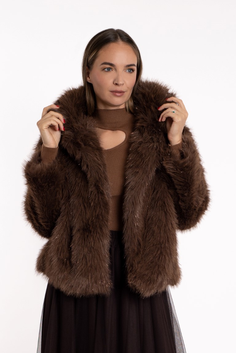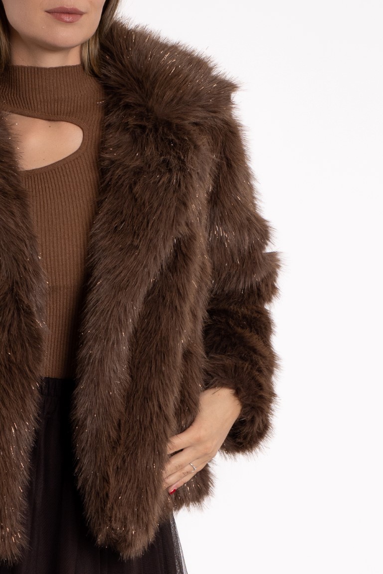 Kratka bundica od umjetnog krzna sa sjajnim nitima- smeđa