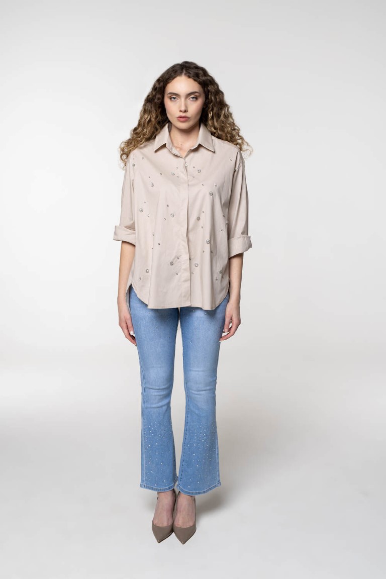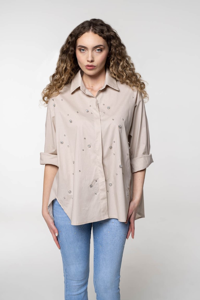 Oversized pamučna bež košulja sa ukrasnim kamenčićima.