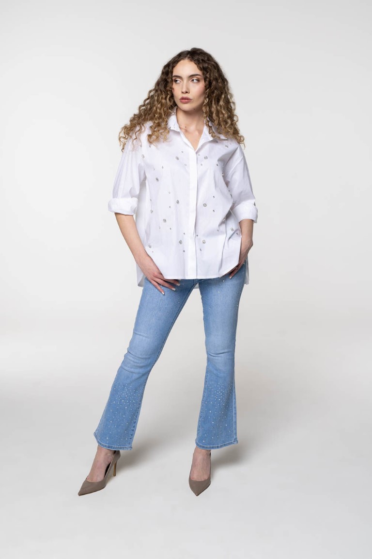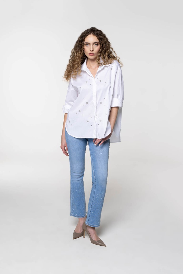 Oversized pamučna bijela košulja sa ukrasnim kamenčićima