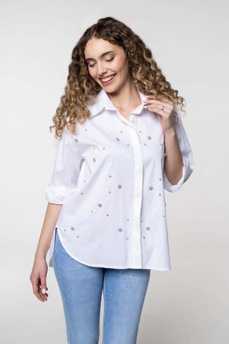Oversized pamučna bijela košulja sa ukrasnim kamenčićima.