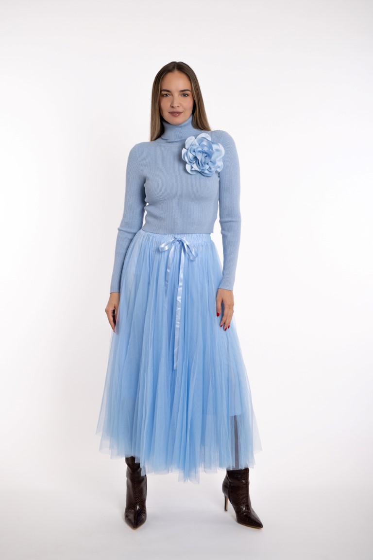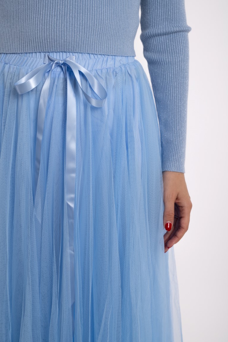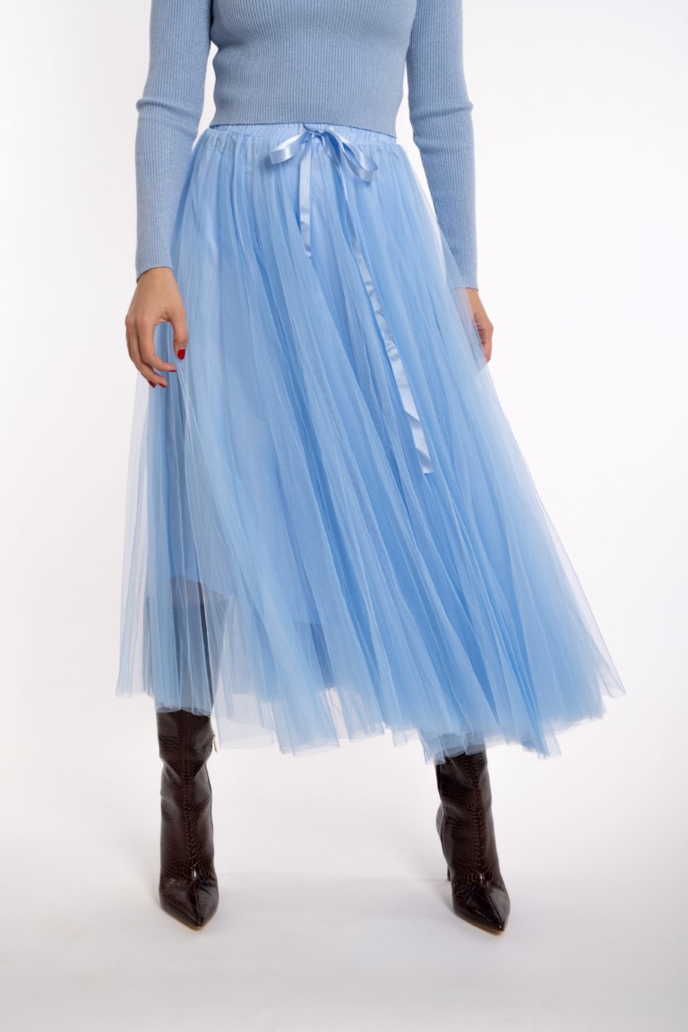 Udobna plava plisirana midi suknja od tila sa podstavom i ukrasnom trakom oko struka.