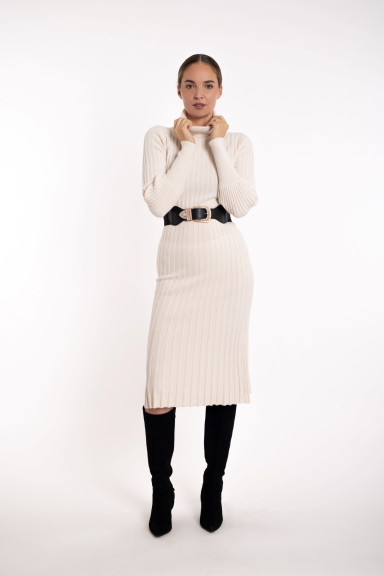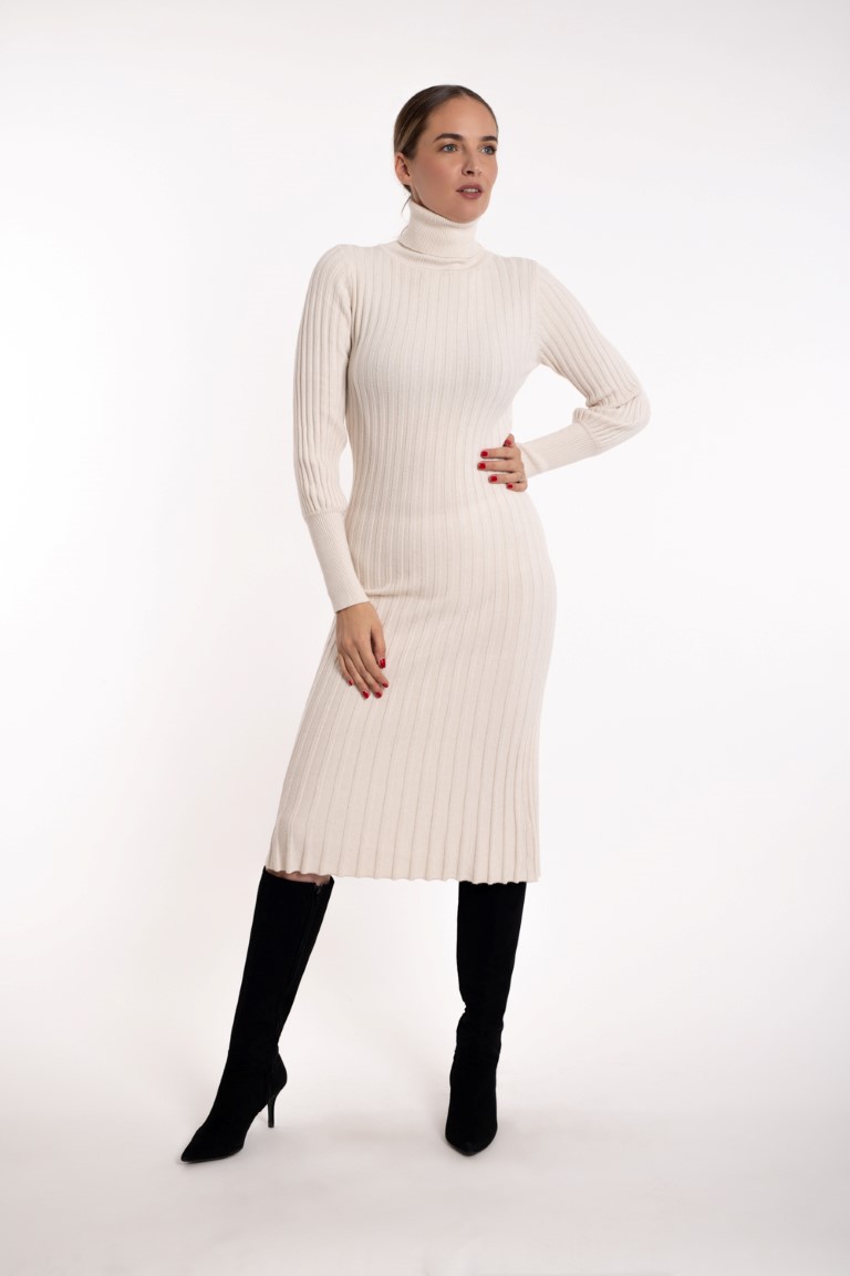 Mekana bijela rebrasta vunena dolčevita-haljina.